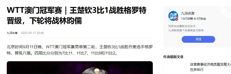 WTT澳门冠军赛|王楚钦3比1战胜格罗特晋级,下轮将战林昀儒 九派体育 2025-09-11